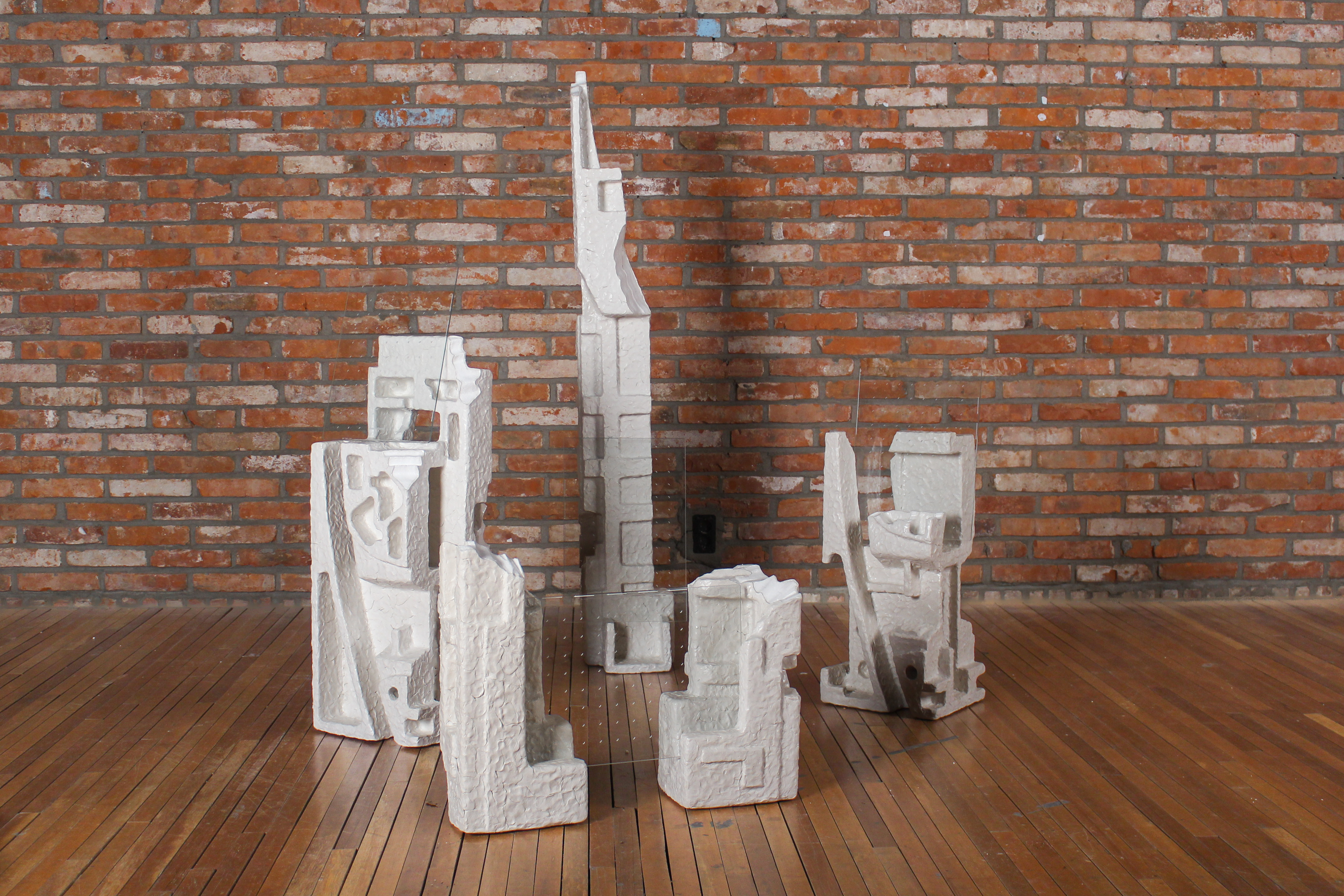 packing styrofoam, paper clay, acrylic coat, glass from the old fridge someone used