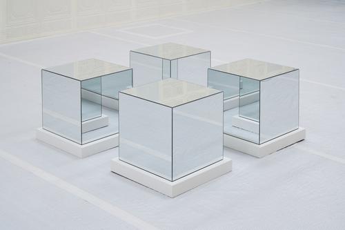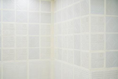 《깊게 얕은》에선 화이트 큐브와 조각의 역사를 떠올리게 될지도 모른다. 그러나 어딘가 비틀린 듯한 인상과 의심쩍은 기운이 전시 전반에 걸쳐 짙게 드리워진다. 조각이 은박지에 쌓여 세워지거나 혹은 뉘어져 공간을 빼곡히 장악한다면, 벽면은 바로크-로코코 시대의 장식을 모방하는 타일이 격자로 덮여 있다. 중앙엔 거울 큐브가 좌대를 딛고 은빛 작품을 비롯한 공간 전체를 반사한다. 바닥은 보양재가 깔린 채 경계면의 테이핑을 그대로 드러낸다. 전시장과 작품 표면을 모두 덮어버린, 다분히 의도적인 이 전시가 무언가를 감추면서도 드러내야 할 것을 드러내고 있다는 점은 분명하다.
