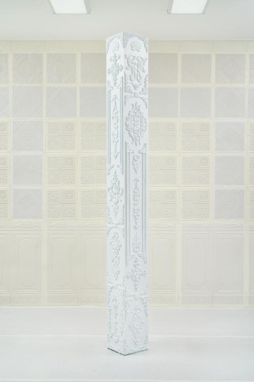 은빛 표면은 김민훈이 이전에도 사용한 기법이다. 작가는 물체의 절단면에 은분을 덧발라 표면과 물질의 가시성을 강조하고, 이를 서사로 확장하는 장치로 삼았다. 이번 전시에서 이러한 은빛은 조각 전면을 반사하고, 동시에 거울 큐브의 빛으로 공간 전체를 반사한다. 조각을 덧붙여 감싼 사각형의 은색 필름지는 지난 작품의 겉면만을 암시할 뿐이고, 작품을 바라보는 이의 시선과 신체를 되려 비춘다. 작품을 보는 시선은 이제 공간 전체로 되돌려지며, 응시의 방향은 울퉁불퉁한 면과 거울을 통해 교란되다가 공간으로 다시 흩어진다. 이렇듯 <은빛 덩어리>라는 다른 이름으로 자리하는 조각은 시각 질서를 재구성하는 물질이 되고, 시선을 분산하지만 좌대를 명밷히 디딘 <Mirrored Cube>는 다른 조각을 비춰 수용하면서 이곳에서 ‘봄’과 ‘보임'의 긴장이 잠재하고 있음을 드러낸다.직립한 은빛 덩어리와 과잉된 장식이 조악하게 느껴질지언정 존재감을 여실히 드러내는 기둥 <희게 일어난 것(I-Beam) 1, 2>의 구성과 배치는 1960년대 조각의 수직 형태를 참조했음을 직감하게 한다. 기둥의 무늬와 동일한 공산품 타일을 규칙적으로 배열해 조각과 화이트 큐브의 의미를 연결하려 하지만, 수공예적 화려함을 넘어 과잉의 극치에 있는 듯한 장식은 ‘중립성의 기호'로 읽히고자 했던 화이트 큐브를 조롱하듯 배반한다. 흰 벽을 통해 객관성을 주장했던 화이트 큐브의 권력을 장식의 과잉으로 무너뜨리는 것이다. 1900년대 건축사에서 장식은 인간의 진보를 방해할 뿐더러 경제적 낭비라고 간주해 타락의 행보를 의미했다는 점 또한 상기한다면, 미술형식과 서사가 ‘보임'의 권력의 자장에 놓여있음을 다시 한번 뒷받침한다.