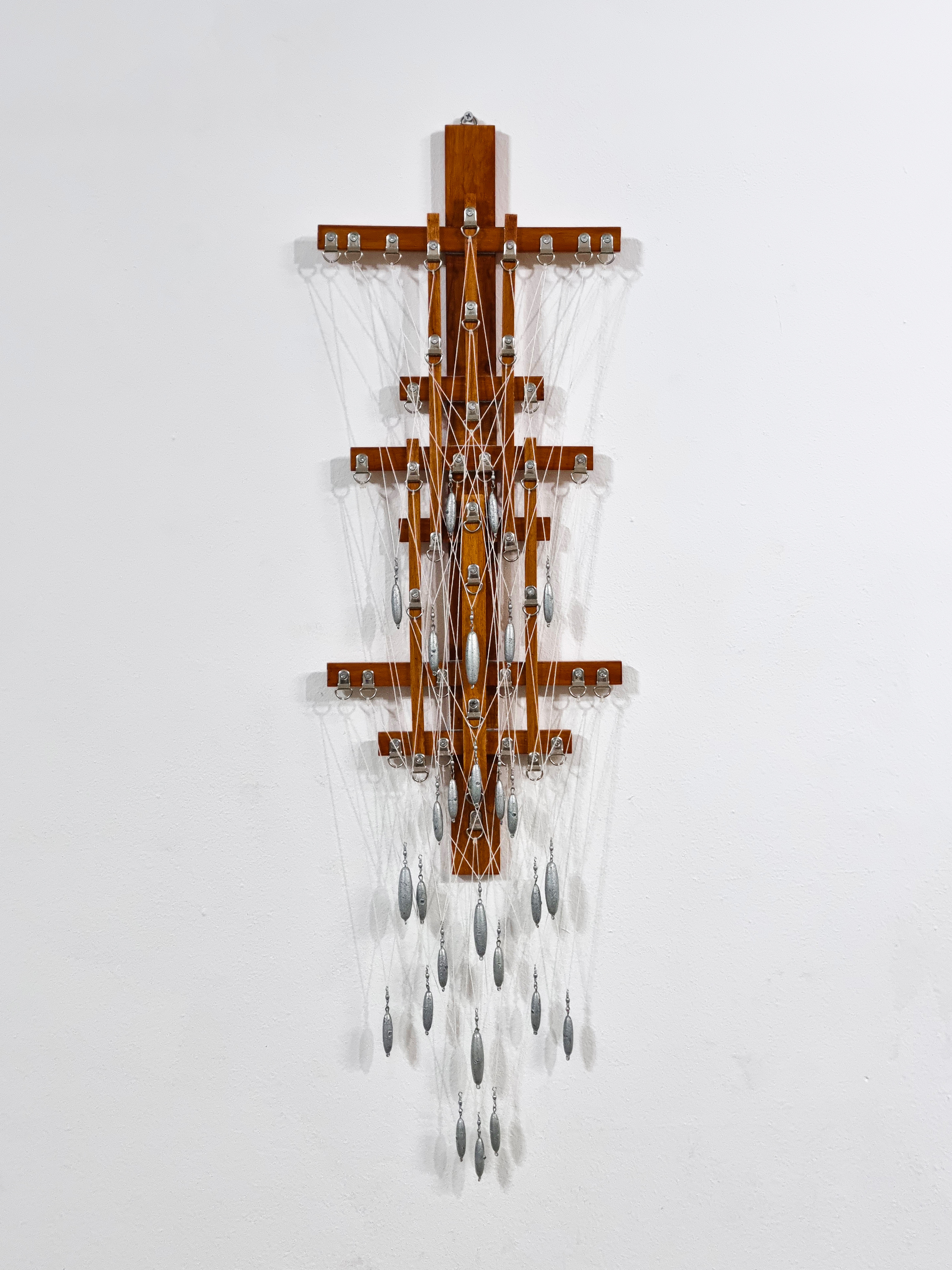 over rubber tree wood, over silver powder paint, over rings and threads with lead weights